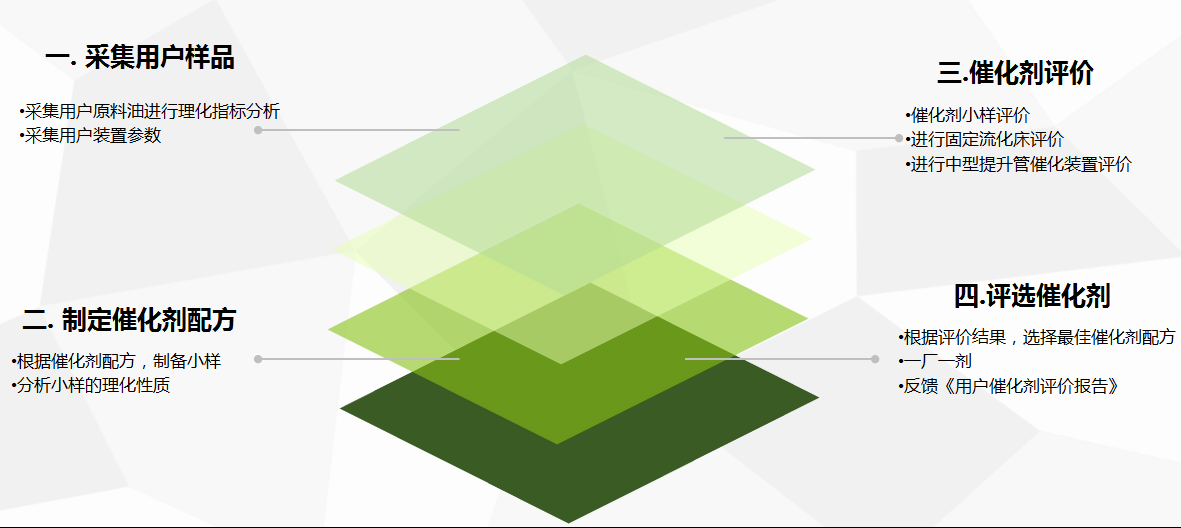 銷售人員負責售前采集客戶生產(chǎn)工藝數(shù)據(jù)、原料油樣品等,然后交由技術服務中心分析,研發(fā)部根據(jù)分析結果制備催化劑小樣,通過重油微反實驗裝置、固定流化床實驗裝置和中型提升管催化裂化裝置,對催化劑配方篩選和工藝效果實施三級評價,根據(jù)評價結果靈活調(diào)整催化劑配方重復試驗并選定最優(yōu)方案交由生產(chǎn)管理部實施定制化生產(chǎn)。